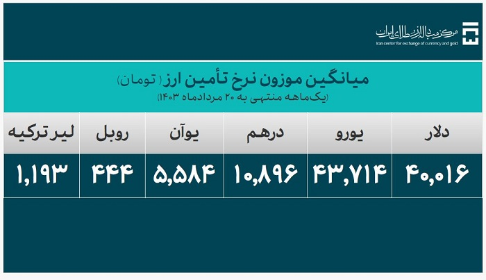 بنا بر این گزارش، میانگین موزون نرخ ارز یک ماهه منتهی به ۲۰ مرداد ماه، ۴۰ هزار و ۱۶ تومان برای دلار، ۴۳ هزار و ۷۱۴ تومان برای یورو، ۱۰ هزار و ۸۹۶ تومان برای درهم و ۵ هزار و ۵۸۴ تومان برای یوآن، ۴۴۴ تومان برای روبل و ۱هزار و ۱۹۳ تومان برای لیر محاسبه شده است.